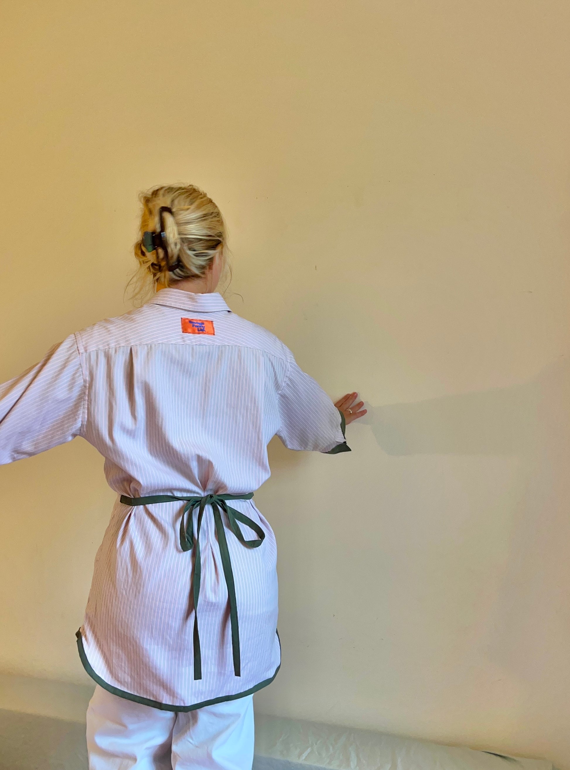Made from a soft 100% cotton pink shirt with added khaki details, this one-of-a-kind dress is light, breathable, and designed for comfort. It’s been shaped with front darts and finished with an adjustable bow at the back for a flattering silhouette.